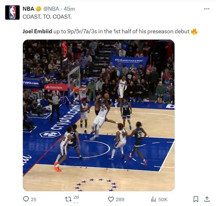 恩比德还完成了一次持球快速反击的上篮,展示了出色的运动能力。上半场比赛,他已经贡献了9分、7助攻、5篮板和3抢断的全面数据。健康的恩比德,依然是联盟中最具威胁的球员之一。